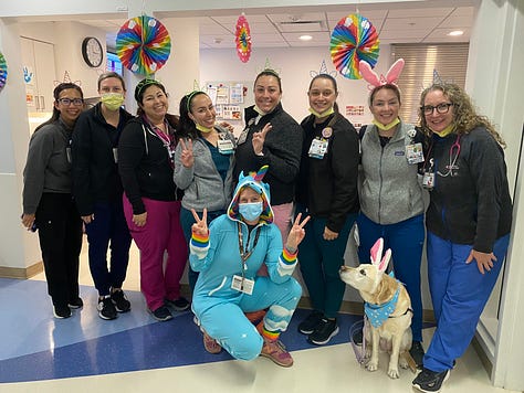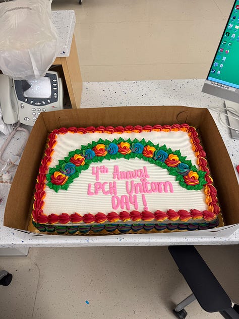 Unicorn Day is for all of us and by us. It’s for the work we do together, the work it would be impossible to do on our own. Unicorn Day is now a tradition that feels well-established, and we seem to have reached some sort of communal inflection point. My friend Jewel refers to it as the “new high holy day” of our little corner of the hospital.