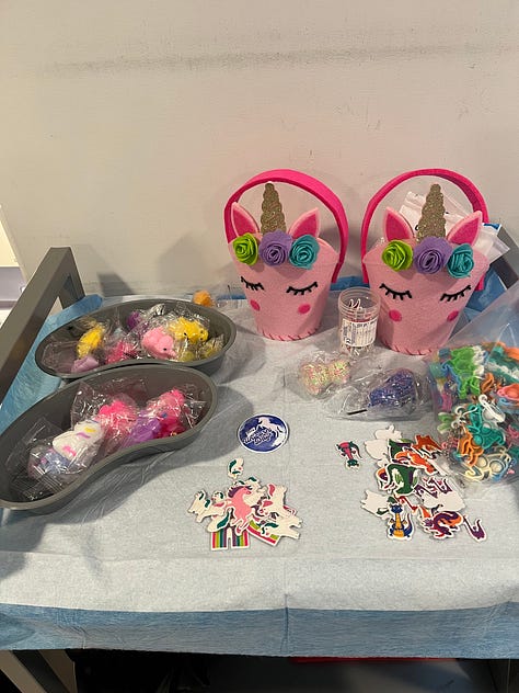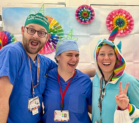 Each year, a new group of people join in. Our boss volunteered to cover the cost and has continued each year to be supportive. The nurse managers started pitching in - helping with organization and showing up in their own themed get-ups. Our brilliant admins in the office helped us get the supplies ordered and into one box for us to schlep across the street to the hospital. Other anesthesiologists showed up at 6:30am to help with set up before checking in their first patients, one of the dedicated pre-op nurses brought in extra unicorn themed items for the patients. Surgeons pitched in to buy pizza. I think the difference between the Unicorn Day we’ve built and a corporate wellness initiative is that we make it for each other.