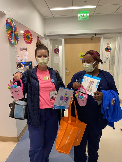 The following spring we held our first Unicorn Day at the hospital. We made it a surprise. Other than asking for access to a small patient room we occasionally use for going away parties, we didn’t tell anyone what we were up to. We showed up at the booty crack of dawn with donuts and cupcakes, enough unicorn horns for the staff, and thanked each person for their service caring for children having surgeries, procedures, and MRIs.